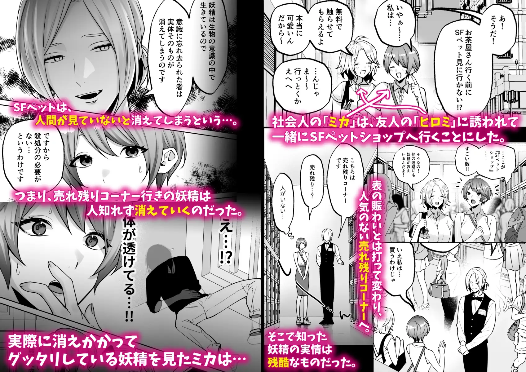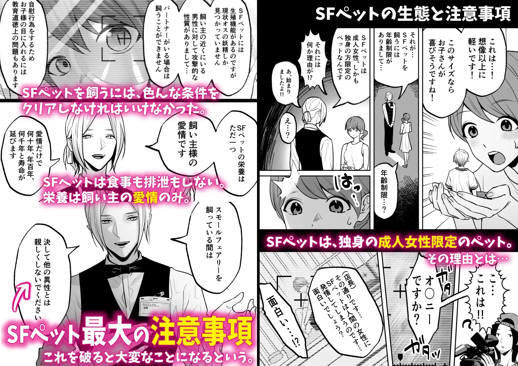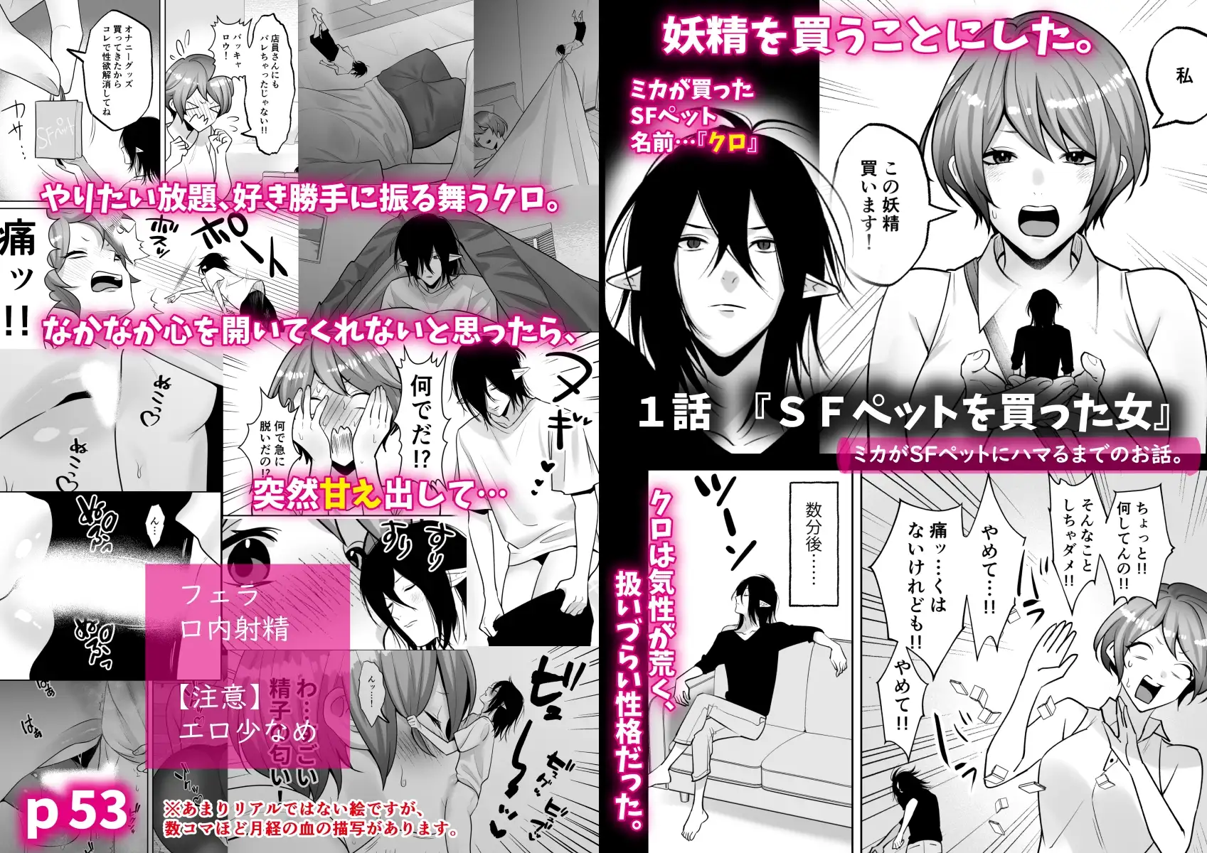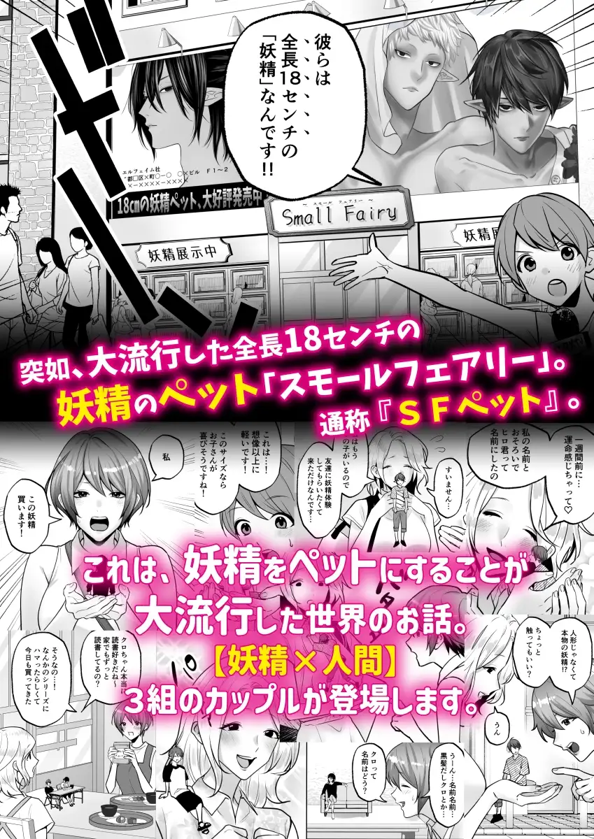 社会人のミカは、友人のヒロミに誘われて、一緒にSFペットショップへ妖精を見に行くことになった。SFペットショップにて、スタッフから「妖精は生物が認識していないと消えてしまう」という話を聞いたミカは、実際に消え掛かった妖精を目にする。心を痛めたミカは、その消え掛かった妖精を飼うことにした。その際、スタッフから「SFペットを飼っている間は、他の異性と親しくないでください。これを破ると大変なことになる」といったような注意事項を受ける。帰宅後、妖精に『クロ』と名付けて仲良くしようとするが、クロは気性が荒く扱いづらい性格だった。それでも何とかクロが寝るまで見守り、ミカもようやく就寝。その夜、クロはミカの寝床に忍び寄り「夜○い」しようと動き出すが、思わぬハプニングが発生する。1話は、SFペットの生態説明と、社会人の『ミカ』がSFペットにハマるまでの話。