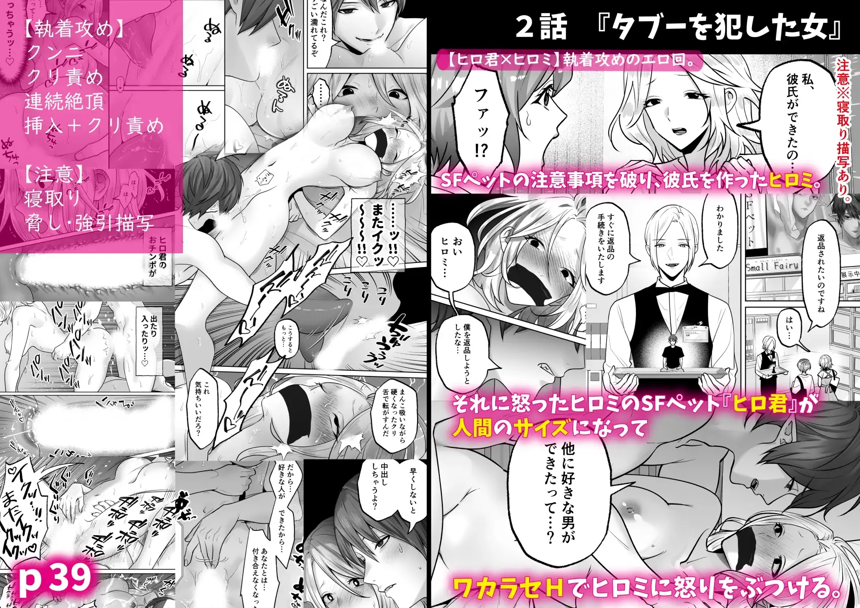ミカの友人ヒロミは、SFペットの注意事項を破って彼氏を作ってしまう。そのせいで自分を返品しようとするヒロミに怒りが止まらないヒロミのSFペットの『ヒロ君』は、ヒロミに執拗にクンニ+クリ責めをして連続絶頂させながら、強○的に「返品しない」と言わせ、更に彼氏と別れろと命令する。さもないと「中出しする」と脅されたヒロミは、やむなくヒロ君に従うことにしたのだが…。2話は、執着攻めの『ヒロ君』が独占欲ムキ出しで飼い主である『ヒロミ』にワカラセHする寝取り回。