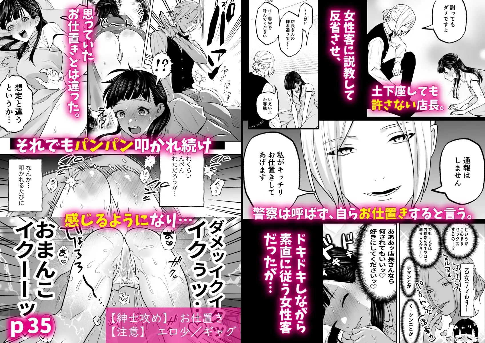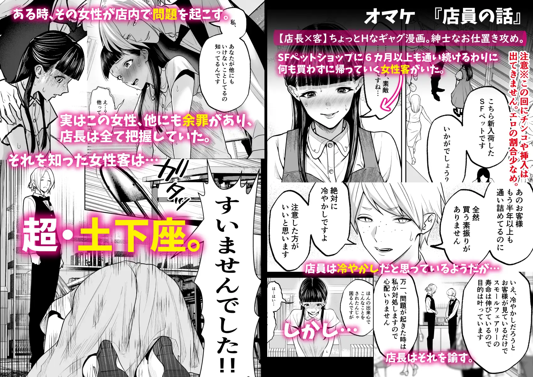 SFペットショップに6カ月も通い続ける割には、何も買わずに帰っていく女性客がいた。店員は「冷やかしだ」と思っているようだが、店長は「何かあったら自分がなんとかする」と言って諭す。しかしあるとき、その女性客が店内で問題を起こしてしまい、店長はその女性客と2人きりで話をすることになる。実はこの女性客は他にも余罪があり、店長はすべて把握していた。店長に何もかも知っていると言われた女性客は土下座しながら泣いて謝るが、店長はそれを許さず、彼女はその場でお仕置きを受けることになった。しかし、お仕置きの最中、女性客は感じてしまい、絶頂しながら盛大に潮を垂れ流すという失態を犯してしまう。後半、尻上がりにテンションがおかしくなっていく店長と女性客。ちょっとHなギャグ漫画で、爽やかなラスト。